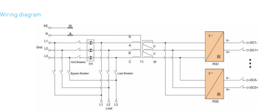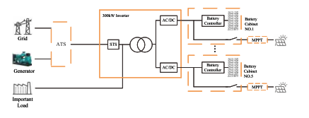 Funkció A rendszer moduláris inverter egységeket használ párhuzamos konfigurációban, ahol minden inverter modul DC bemenete egy dedikált akkumulátorszekrénynek felel meg, klaszterenkénti menedzsment lehetővé teszi a között keringő áramok kiküszöbölését akkumulátor húrok. Az AC/DC tápmodulok rugalmas telepítést támogatnak mind mennyiségben, mind névleges teljesítmény, 60 kW maximális kapacitású modulok 5 egységben párhuzamosan konfigurációt. A teljesítménymodulok váltakozó áramú kimenete transzformátoron keresztül érkezik elszigetelt végfokozat, amely erős ellenállással látja el a terhelést jelenlegi sokk. A hibrid ESS DC-csatolt fotovoltaikus integrációt alkalmaz, ami magas energiaátalakítási hatékonyság és optimalizálva a hálózaton kívüli forgatókönyvekhez PV-vel termelési kapacitás meghaladja a terhelési igényt; Kültéri besorolású MPPT vezérlők integrálja a kombináló és az MPPT funkciókat egyetlen edzett házba. A teljes rendszer tartalmaz egy dízelgenerátoros ATS opciót, egy 300 kW-os hibridet inverter, PV MPPT vezérlő és akkumulátor energiatároló rendszer.
